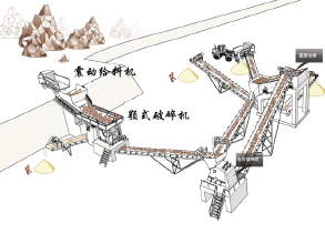 首先,石料由粗碎機進行初步破碎,破碎后的粗料由膠帶輸送機輸送至細碎機進行進一步破碎,細碎后的石料經振動篩篩分,滿足制砂機進料粒度的石子進制砂機制砂,不滿足進料粒度的石子返回細破再次破碎直至符合要求。進制砂機的石子制砂后經振動篩篩分符合成品要求的經洗砂機(可選)清洗后輸送至成品堆,不符合要求的返回制砂機再次加工,直至符合要求。